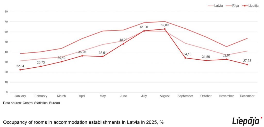 The average annual occupancy rate of Liepāja accommodations in 2024 was 38.9%, while the bed occupancy rate was 31.7%. According to CSP data, the highest occupancy rate was recorded in August, when 62.6% of guest rooms and 54.9% of beds were occupied on average in the city.