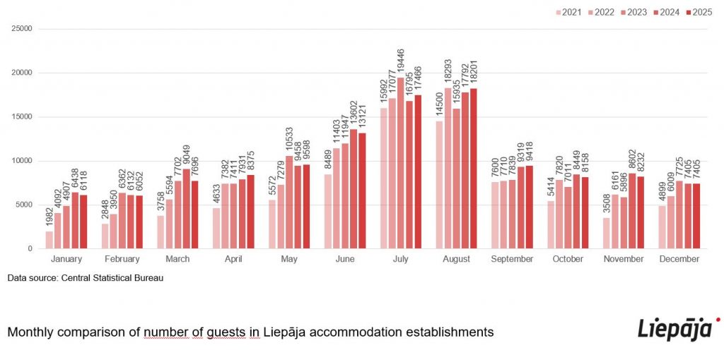 According to data from the Central Statistical Bureau (CSP), 120,972 tourists stayed overnight in Liepāja in 2024, which is 7.3% more than in 2023 and is also the highest figure recorded in the history of the city’s tourism data collection. The number of nights spent has increased by 10%, reaching 216,326 nights, also surpassing last year’s record. Latvian visitors have decreased by just under a hundred overnight guests, but the total number of nights spent has increased. Foreign tourists grew by 21.6%, while their overnight stays increased by 26.1%. The average length of stay in Liepāja accommodations was 1.79 nights.