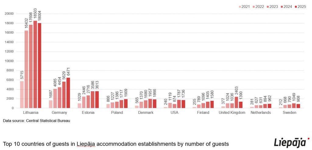 The top three foreign visitors to Liepāja accommodations remained the same as in 2023. The most overnight guests came from Lithuania, with 18,503 visitors, which makes up 39.3% of all foreign overnight visitors and represents an increase of 4.6% compared to 2023, from Germany, 5,629 visitors or 12% with an increase of 26.4%, and from Estonia, 3,586 visitors or 7.6% with an increase of 32%. The distribution of visitors from more distant countries was largely influenced by two major international events held in Liepāja. The United Kingdom ranked fourth with 2,403 visitors or 5.1%, showing an increase of 132%, followed by Denmark with 1,957 visitors or 4.2% and an increase of 16.5%, the United States with 1,787 visitors or 3.8% and an increase of 104.5%, Poland with 1,717 visitors or 3.7% and an increase of 23.9%, Finland with 1,405 visitors or 3% and an increase of 28.2%, and Sweden with 1,049 visitors or 2.2% and an increase of 32.8%. In total, tourists from 103 countries stayed overnight in Liepāja in 2024, compared to 100 countries in 2023, including 26 countries from which at least 100 tourists arrived.