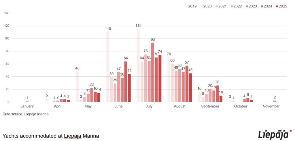 In 2024, the Liepāja Marina yacht harbor served 243 yachts from 17 countries, with the most visitors arriving from Lithuania, Poland, Germany, Sweden, Finland, and Latvia. Additionally, two cruise ships docked in Liepāja’s port, bringing around 1,200 passengers.