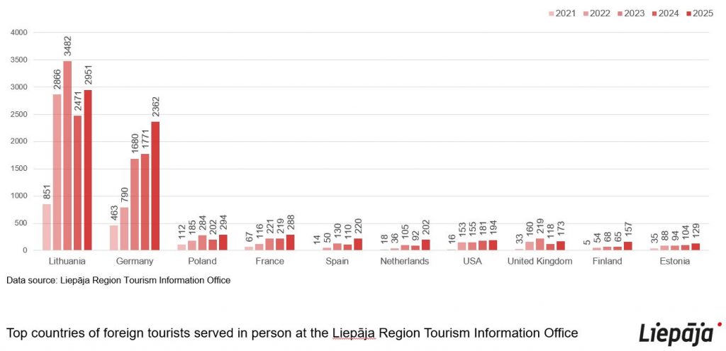 The Liepāja Regional Tourism Information Office (LRTIB) served 15,603 visitors in 2024, of whom 17% were Latvian tourists, 40% were foreign tourists, and 43% were residents. The most frequent visitors seeking information came from Lithuania, Germany, France, Poland, the United States, and the United Kingdom. In total, the LRTIB served tourists from 61 countries in 2024.