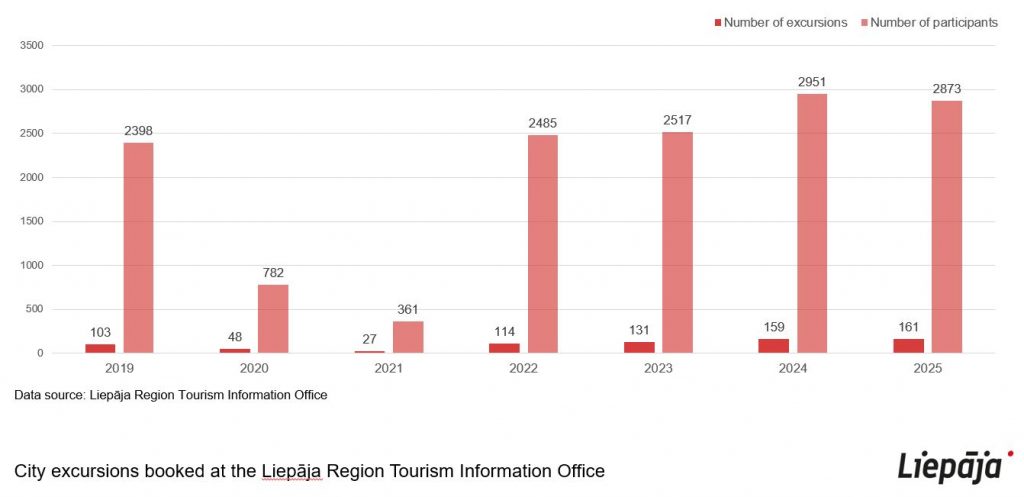 Liepāja’s tour guides conducted 159 tours arranged by LRTIB, introducing around 3,000 guests to the city’s history and present. Visitors on guided tours came from all four historical regions of Latvia, with the most tourists arriving from Riga, Daugavpils, Dobele, and Kuldīga. Additionally, guided tours were attended by tourists from Lithuania, Germany, Finland, Poland, Japan, the Netherlands, the United States, and other countries.